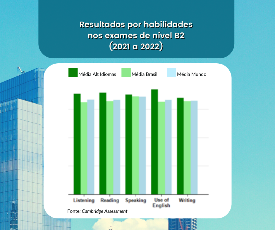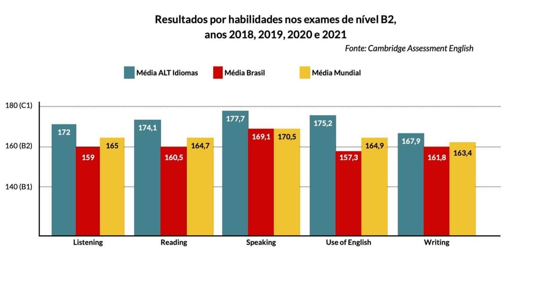 Temos uma alegria e satisfação muito grandes ao saber que, pela Cambridge Assessment, somos a maior média Global e Nacional em certificação internacional de Inglês no nível B2, do Quadro Europeu Comum de Referência para Línguas. Uma alta mantida desde 2018. Segue abaixo o quadro de médias de 2021 a 2024.